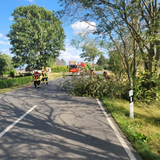 Auf ihrer Fahrt durch den Stadtholz stürzte aus noch ungeklärter Ursache eine Buche auf die Straße und den PKW. Der PKW wurde dabei im Bereich der Motorhaube, Frontscheibe und Dach schwer beschädigt. Einige Äste drangen sogar bis in Motorraum vor, sodaß wahrschein Totalschaden am PKW entstand. Die Insassen blieben dabei unverletzt, wurden aber durch den Rettungsdienst vorsorglich betreut.