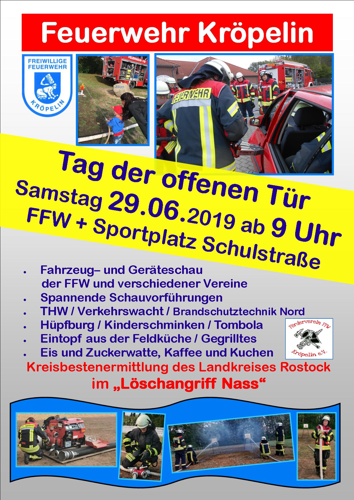 Am Sonnabend den 29.06.2019 findet ab 09.00 Uhr am Standort des Löschzuges Kröpelin, anlässlich des 112 jährigen Bestehens der FFW, ein Tag der offenen Tür der Gemeindefeuerwehr Kröpelin statt. Ab 8.00 Uhr findet auf dem Sportplatz in der Schulstraße der Kreisbestenausscheid in der Kategorie Löschangriff Nass statt.