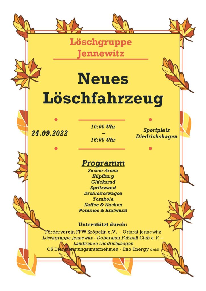 Am Sonnabend den 24.09.2022 soll um 10.00 Uhr die feierliche Übergabe des neuen Löschfahrzeuges TYP TSF-W an die LG Jennewitz erfolgen. Im Zeitraum vom 10.-16.00 Uhr ist dann ein buntes Programm mit Hüpfburg, Drehleiter, Soccer-Arena und vielem mehr geplant. Für das leibliche Wohl vor Ort wird gesorgt. Kommen Sie gern vorbei und schauen Sie sich das Fahrzeug ihrer Löschgruppe an.