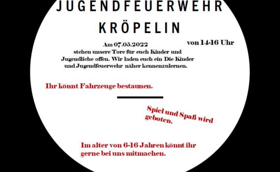 Am Sonnabend den 07.05.2022 von 14-16.00 Uhr sind alle Interessierten Kinder und Jugendlichen im Alter von 6-16 Jahren eingeladen, die Kinder und Jugendfeuerwehr Kröpelin kennenzulernen und Mitglied zu werden. Man kann die Fahrzeuge bestaunen, Spiel und Spaß wird geboten. Wer interessiert ist kann gerne vorbeikommen. Falls jemand verhindert ist, kann […]