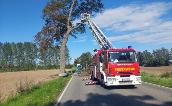 Am Mittwoch, den 16.08.2023 um 16.00 Uhr wurde die Kameraden des Löschzuges Kröpelin zu einem Baumhindernis alarmiert. Es drohte auf der B105 Richtung Neubukow ein großer Ast auf die Fahrbahn zu stürzen. Die Kameraden sicherten die Einsatzstelle und entfernten den abgebrochenen Ast mittels Motorkettensäge über die Drehleiter.